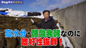 やむお得なく高水分でロールしてしまった場合、極寒の冬の北海道では、当然、ガチガチに凍ります。 が、活性誘導水を十分に添加した場合は、高水分でも凍りにくいロールができます。 北海道別海町の(株)フィードバンクさんでロールを […]